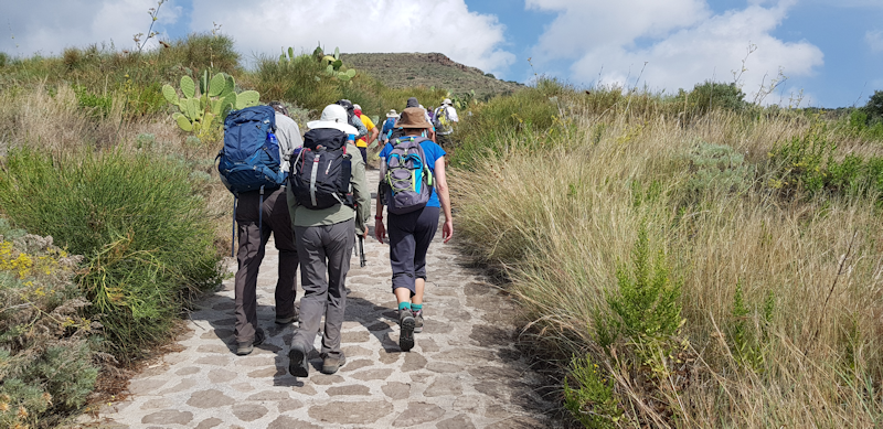 Around 4.10pm and all kitted out with sticks and helmets, we follow our guide, Manuel, on our long hard trek to the summit of Stromboli (924m).