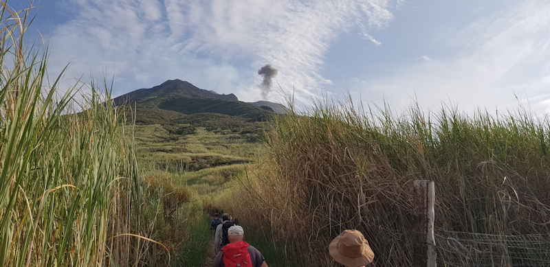 Today our afternoon walk takes us to the north west of the island to a point about half way up to the crater so we can observe the volcano for a while in darkness. In this photo a puff of ash and smoke shows another mini eruption.