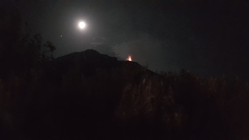 We descend the mountain and some of us stop at the Observatory where there is a restaurant and bar. Here a small magma eruption is caught on camera as I enjoy a beer. The moon just happens to be in place to light up the scene.