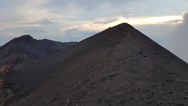 Now at 6:40 pm, with the light fading, we are on the last leg of the climb which will take us to the top with the volcano craters below us on the other side of the summit.