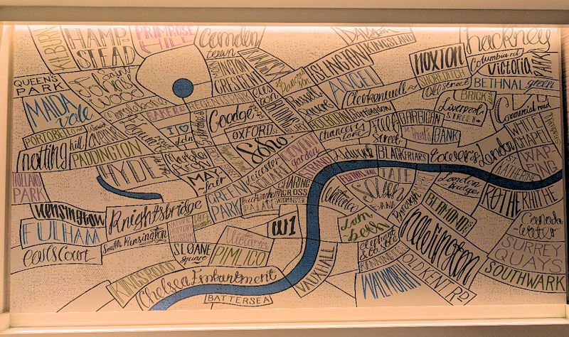 After a while we booked into the hotel, the Hub Premier Inn Covent Garden. The rooms were small, a new concept with the bed filling the whole room and the en-suite behind. It was comfortable and a great base for a discovery day in London. The photo shows the main suburbs of London, many of them appearing on a Monopoly board. On this evening we went to the Sondheim Theatre to see Les Miserables. Afterwards we had a pint in the Salisbury, near the hotel and another one in the hotel bar. |