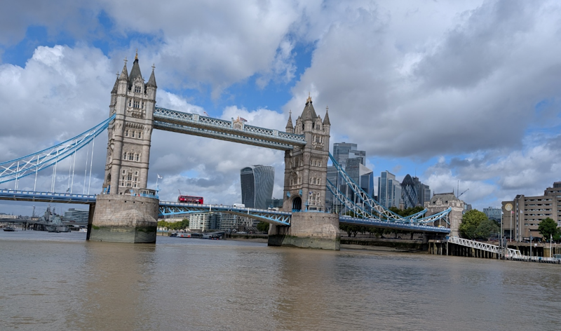 Crossing Tower Bridge, with some of the skyscrapers in the scene, including the 'walkie talkie'. | ![]() |