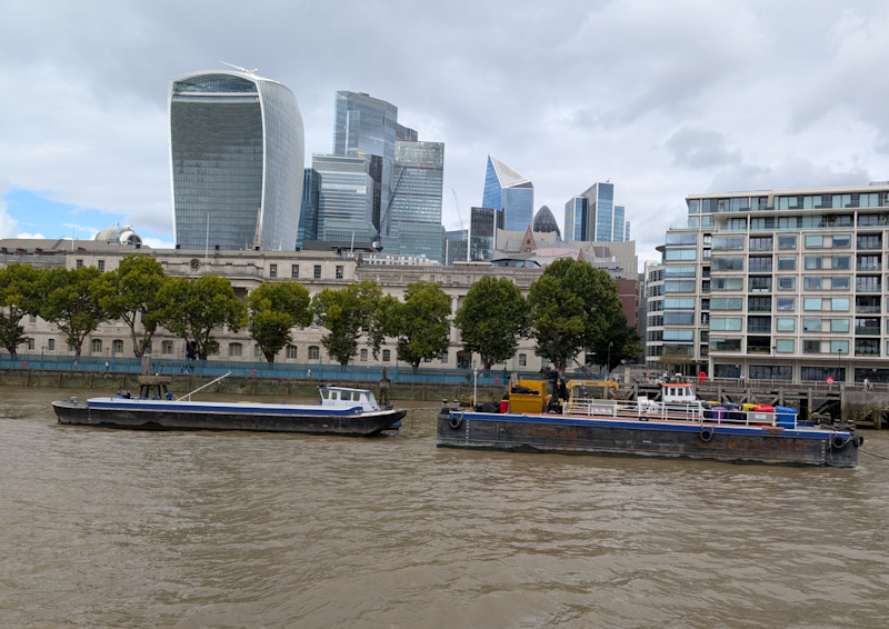 Barges on the Thames, with the familiar cluster of tall buildings. | ![]() |
