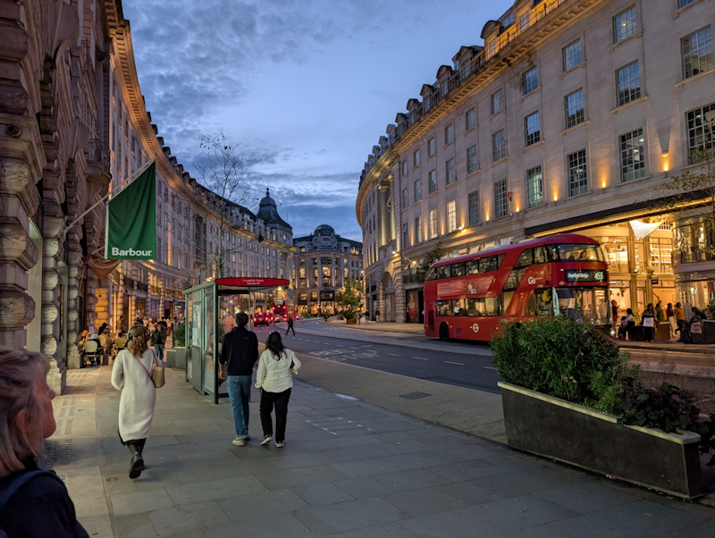 Jane and I did a walk to Picaddilly Circus to walk off the huge pies we'd both eaten. This is a nice view of Regent Street as it curves away west from the Circus crossroads. |