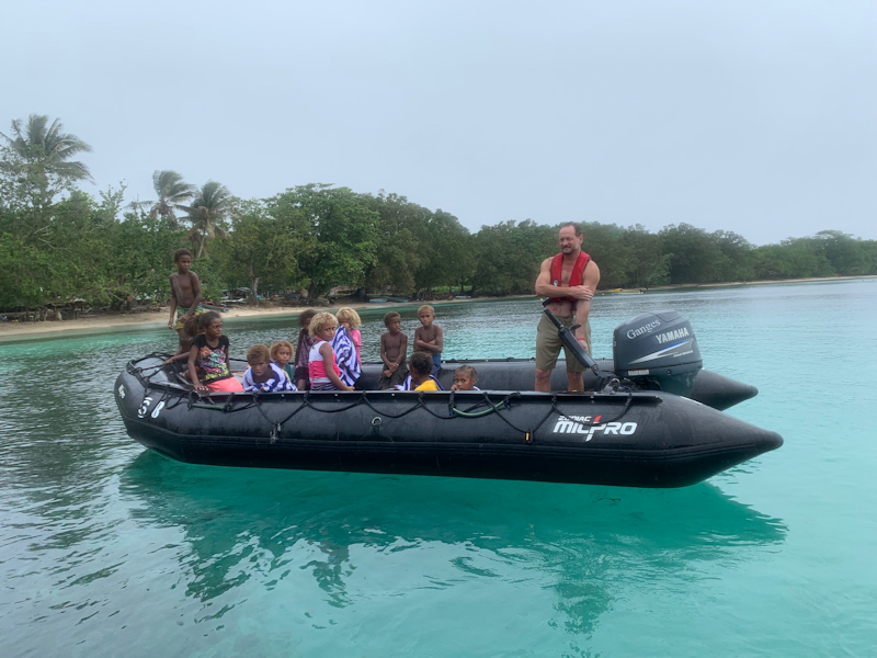 Our expedition leader, Craig, takes a number of local children on a ride in one of the Zodiacs.