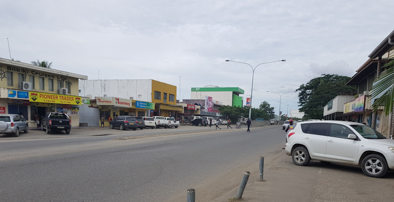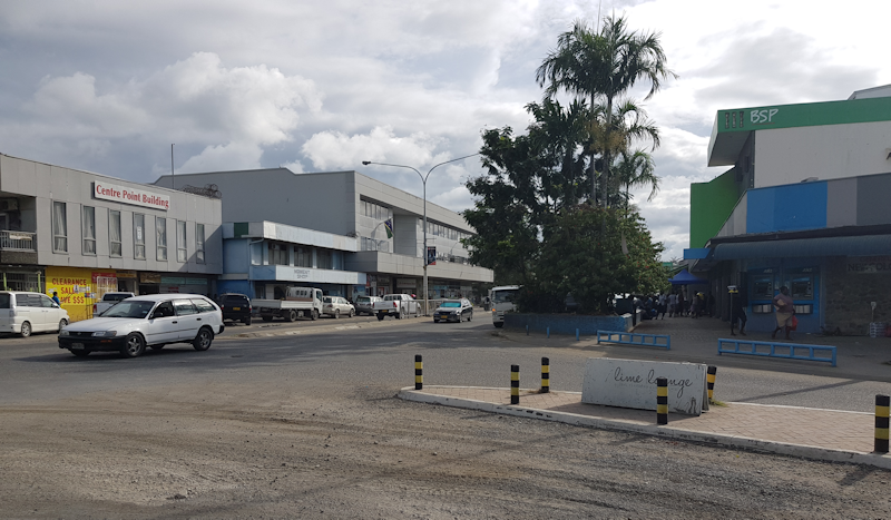 A bit further on, the large green building is the BSP (Bank of the South Pacific).