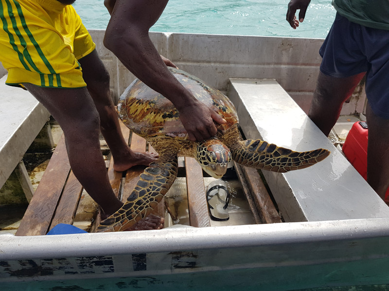 The local guys managed to capture a medium sized Green Turtle and transferred it over to our Zodiac.