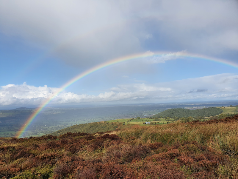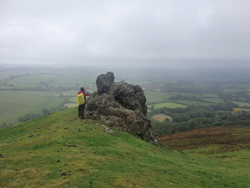 On the second leg, most of the group had decided to call it a day. Richard led just me, Nick and Allie around and up Caer Caradoc Hill. This hill has a history with battles between the Romans and ancient Briton tribes. We saw a cave which was a lookout post. In this photo my long shadow is visible as I look northwest to across The Lawley. |