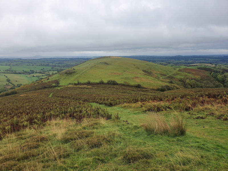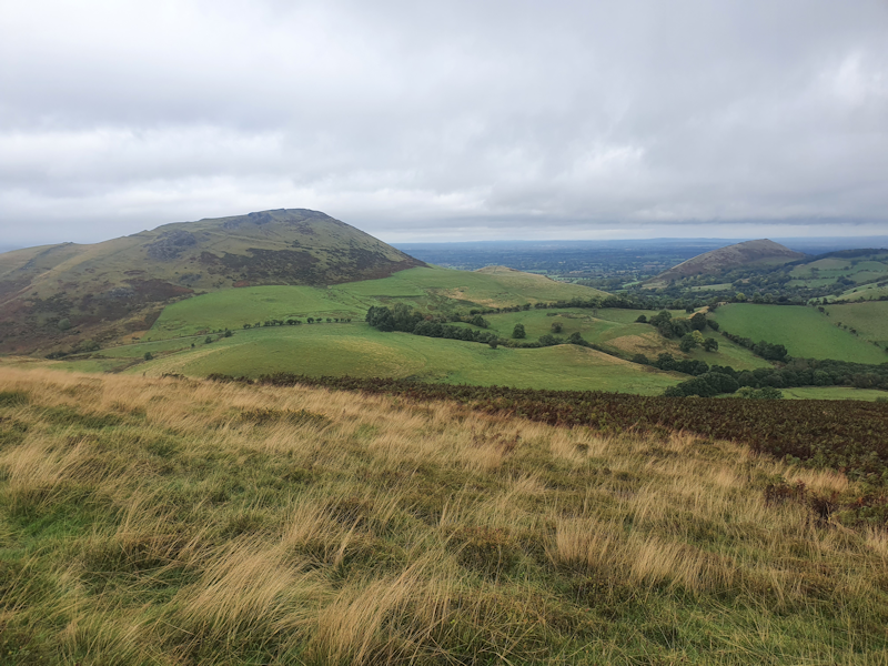 Looking to the north at the same point, we can see the distinctive shapes of Caer Caradoc Hill (left) and The Lawley (right). Four of our number will go on to climb both these ridges two days hence. |