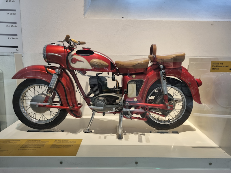 In the afternoon I decided to visit the Dresden Transport Museum (Verkehrsmuseum Dresden) which displays vehicles of all modes of transport, railway, shipping, road and aircraft. Having had an MZ TS 150 motorbike in my twenties, it was nostalgic to see this 175 cc bike, produced in the same factory at Motorradwerk Zschopau. |