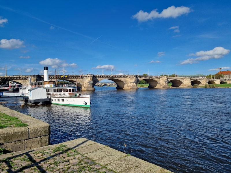 The Augustus Bridge, built of sandstone in the early 1900s, crossing the Elbe which runs through Dresden.