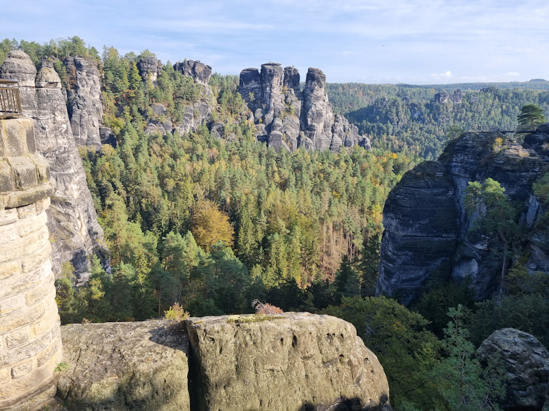 Day 4 (Monday 14th October) The final day was to me the best day of our short stay. We travelled by train about 17 miles southeast of Dresden to exploredsome of the natural and man-made scenery in the vicinity of the River Elbe. Part 1 of the day's program was a visit to the spectacular sandstone cliffs of Saxon Switzerland National Park. We had a coffee at the start, where there were viewing platforms high up, overlooking the River Elbe. Here is a typical view of the eroded sandstone formations above the Elbe flowing from the east. At this point we are only about 10 miles from the border with Czechia. |