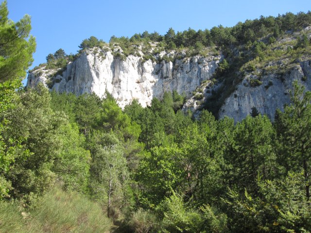(19) Intriguing, this is the official source of the river Sorgue. In very wet times this 900 foot pit spews out thousands of gallons per minutes from the foot of the cliffs. The river itself emerges in drier times from rocks further down the bed. |