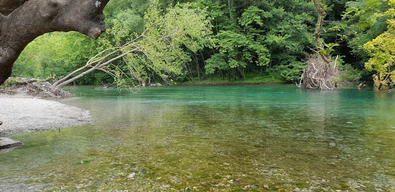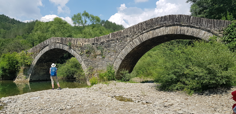 29. After boarding the bus, we move on and stop for a few minutes at the Voidomatis River and skim stones near a bridge. We then move on to our next night's hotel stop in Papingo. |