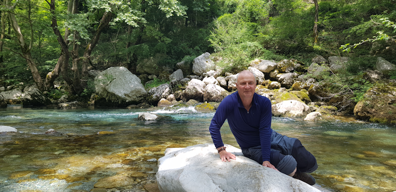| 25. At this point where I'm posing for a photo on a rock, huge quantities of cold spring water emerge from rocks at the base of the cliff. This is snow melt water and north of here the dry river bed becomes a babbling river. | ![]() |