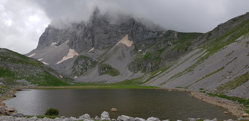 | 41. Below the cloud shrouded peak called 'Astraka', we come back to another lake, with the Refuge just visible on the ridge in the top right of the picture. | ![]() |