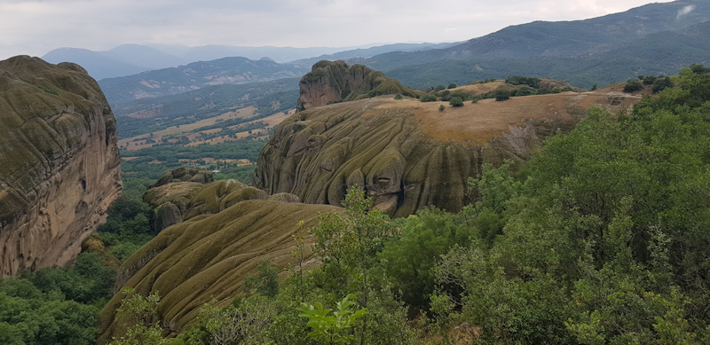 42. Saturday 16 June. A walk around the 'Stone Forest' of Meteora. A collection of huge rock formations composed of river conglomerates thought to originate from a prehistoric river estuary An example of several of these large rocks weathered by rain channels, and with surfaces scars and features which almost make them look alive! |