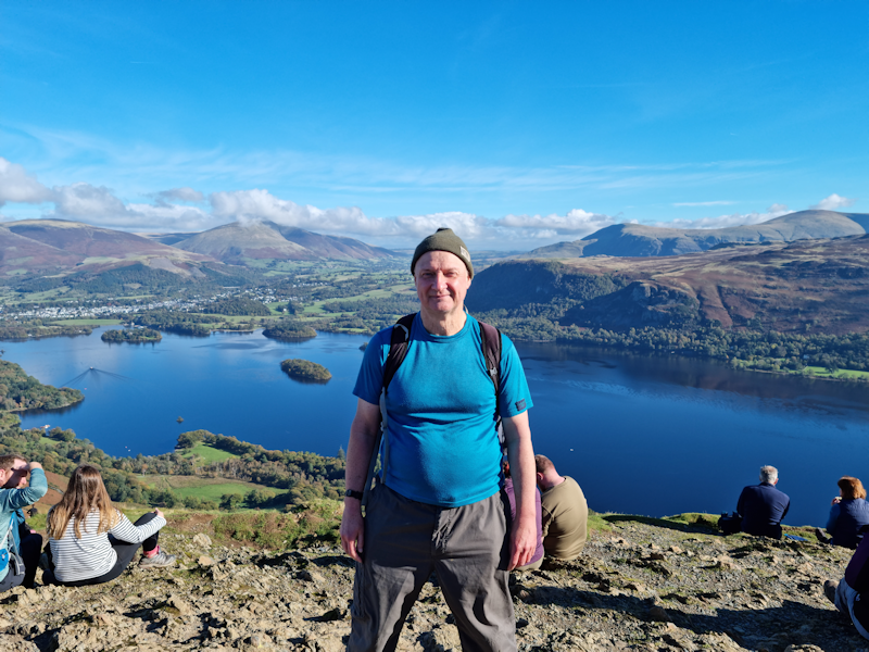 Walk 1 (Tuesday 18 Oct) The first walk was a loop from Derwent Bank, climbing 'Cat Bells' by the steep north (hard) way, down the side of the col to the road and lakeside and back north to the house. This shot was taken near the summit of Cat Bells on this lovely, sunny day. |
