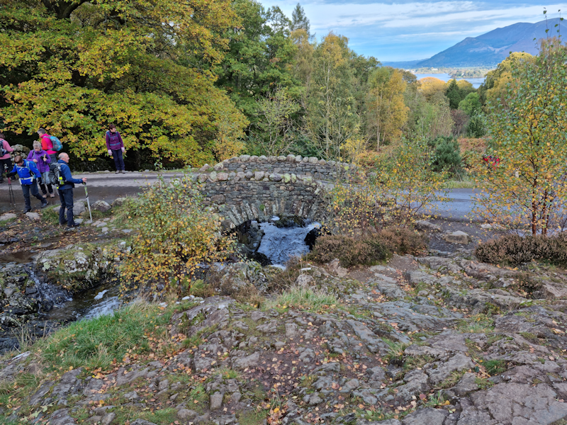 Walk 2 (Wednesday 19 Oct) The route today starts at a car park near to Ashness Bridge, an stone old pack horse crossing. We then have a spectacular view over Derwent Water (Surprise View) and then carry on to the village of Watendlath, with its small lake. We cross a col and descend through oak woodland to the village of Grange. Then we cross the river at the southern end of Derwent Water and walk back parallel to the road and return to the car park. Here we take a look at Ashness Bridge before seting off on the walk. |