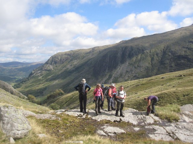(1) (Day 1) On Saturday our hard group approach the rocky scramble at Taylorgill Force (waterfall in photo). Our main objective today is Great Gable. |