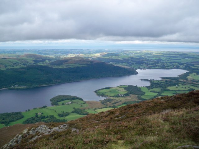 (11) On the summit it turned cold, misty and very windy and we didn't stay up there long. Heading southwest past Little Man, Keswick at the head of Derwent Water comes into view. |