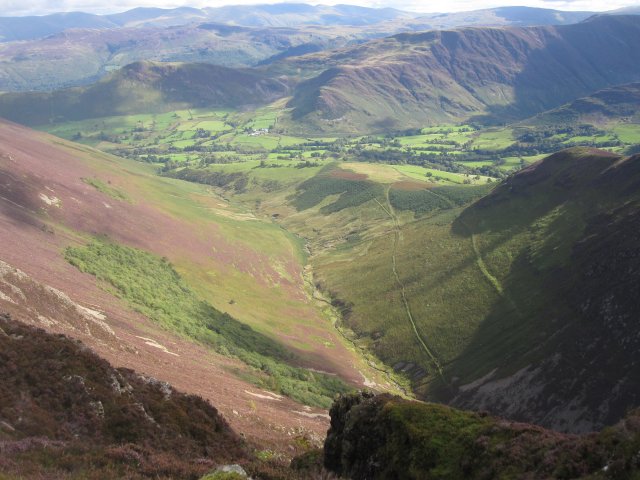 | (12) Heading along the side of White Beck towards Keswick as we say goodbye to the brooding Skiddaw. | ![]() |