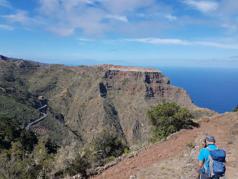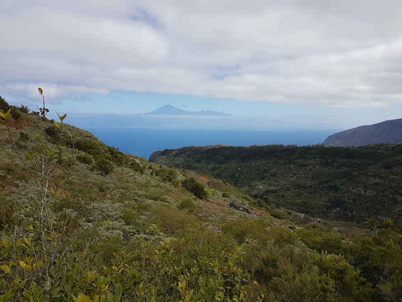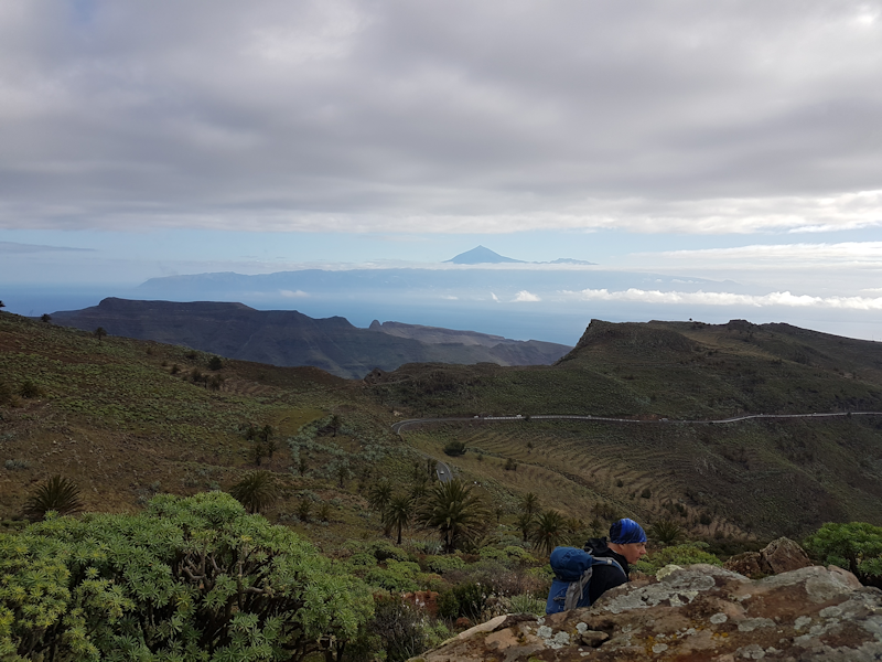 [2: 30 Jan] Upon reaching the plateau we got a good view eastwards to the island of Tenerife with the dominant Pico Teide volcano rising to 3781 m above sea level. |