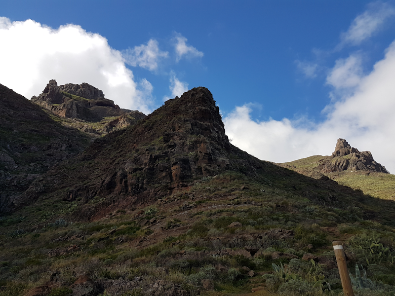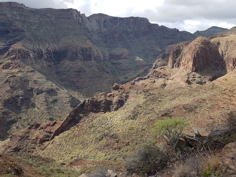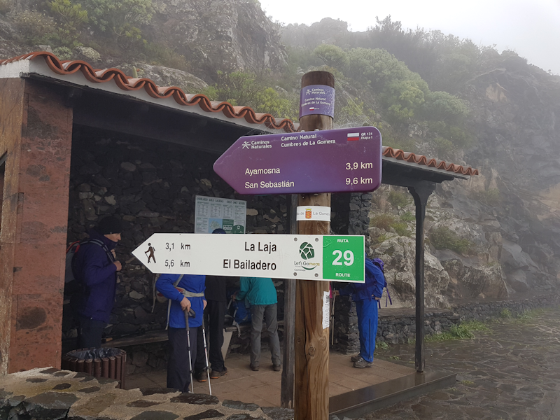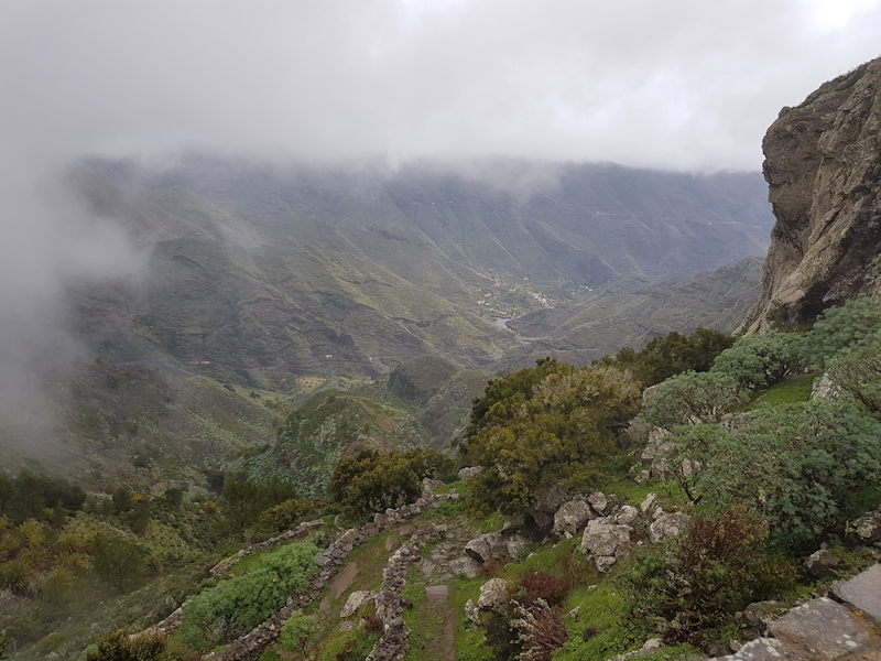[13: 2 Feb] We descend into a valley with the mist above. This mist coming from northeasterly trade winds is the source of most of La Gomera's water. It does not rain very often on the island. |