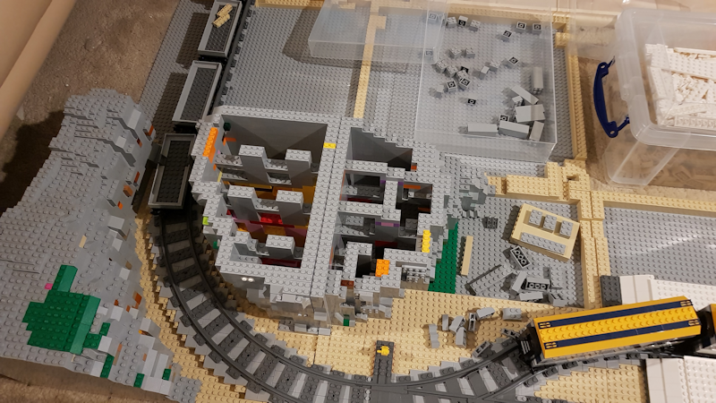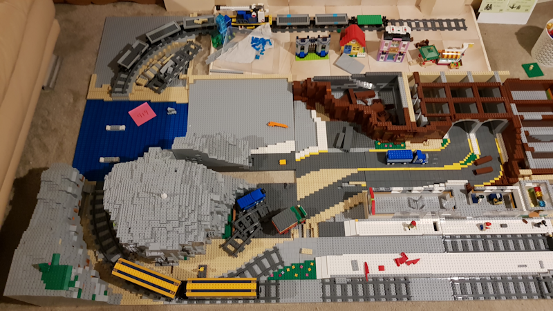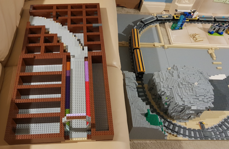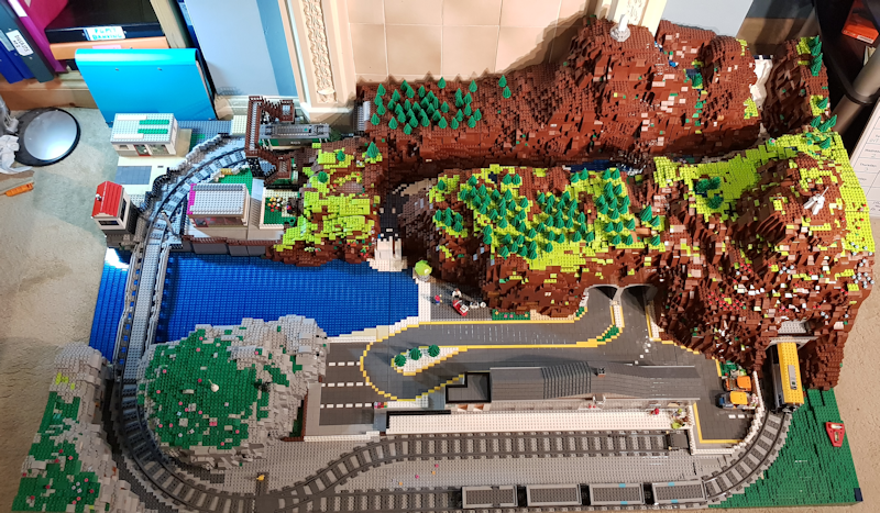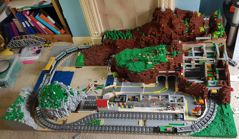 11th February In the bottom left of the layout I started to build limestone crags, with the railway track going through a cutting between two of these masses of rock. Because I was building the layout on 48x48 stud base plates, I had to tailor my construction methods to allow larger topographical features such as mountains to cover more than one baseplate, with each module being detachable from its neighbouring modules. |