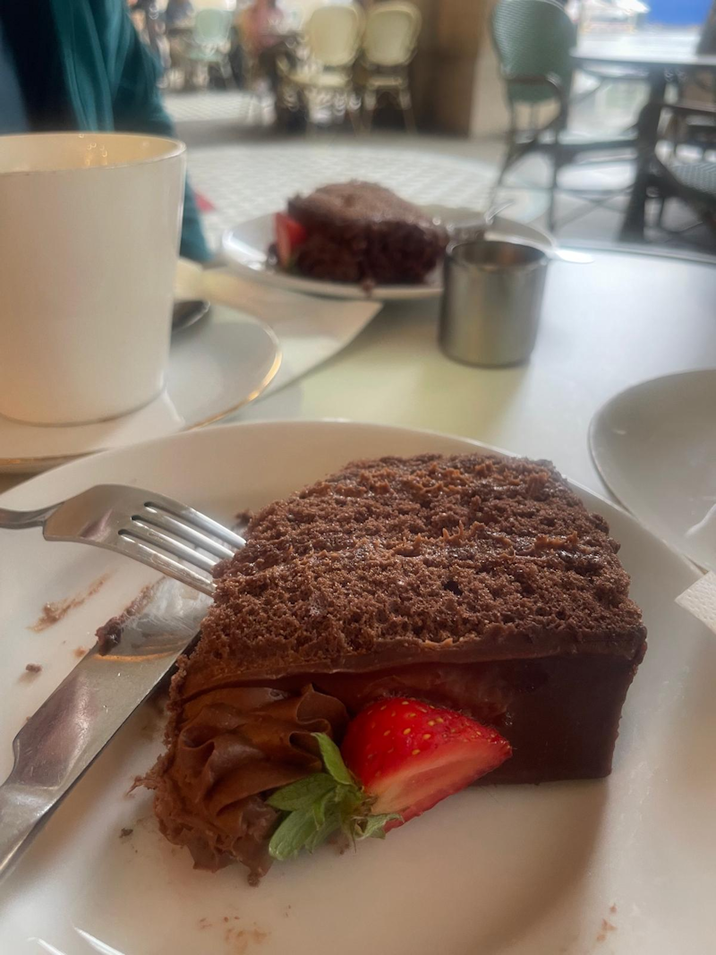 Day 1 (Tuesday 26 August) We took the train from Beverley, first class of course, and the tube to Leicester Square. We headed just down the road to Trafalgar Square and found a nice cafe with a tempting selection of cakes. Both of us chose the chocolate gateau, here it is, it came with a knife and fork and was absolutely delicious! |
