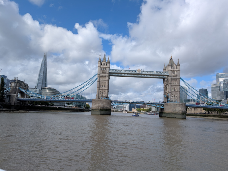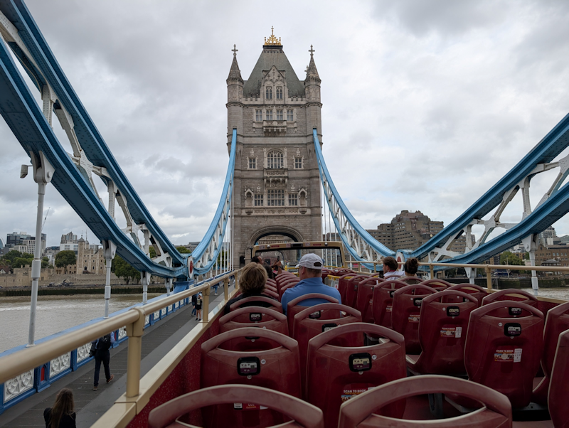 | Crossing Tower Bridge, we were on the back seat of the tourist bus, not many other people joined us on a showery day. | ![]() |