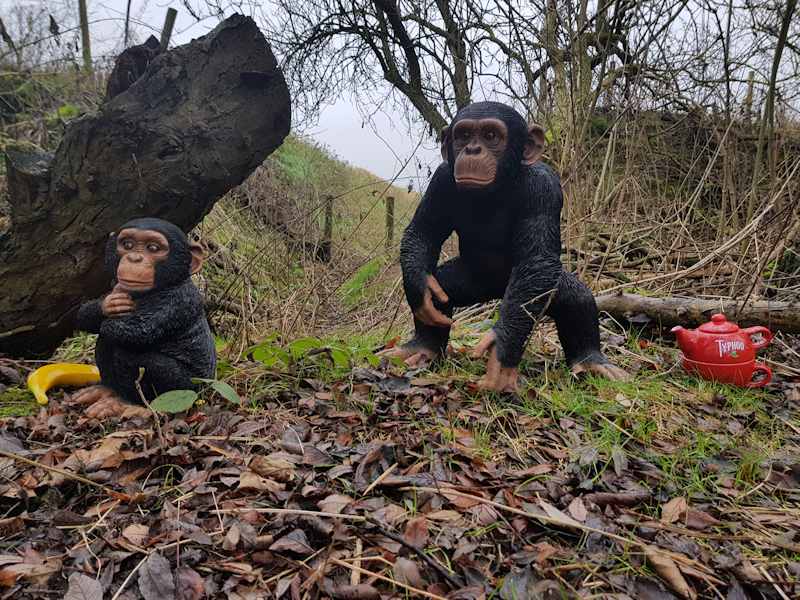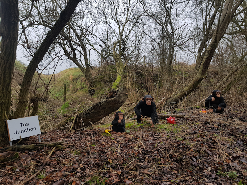 1. Tea Junction is home to a community of three chimps and a Barbary Ape at the junction of two deep dykes. |