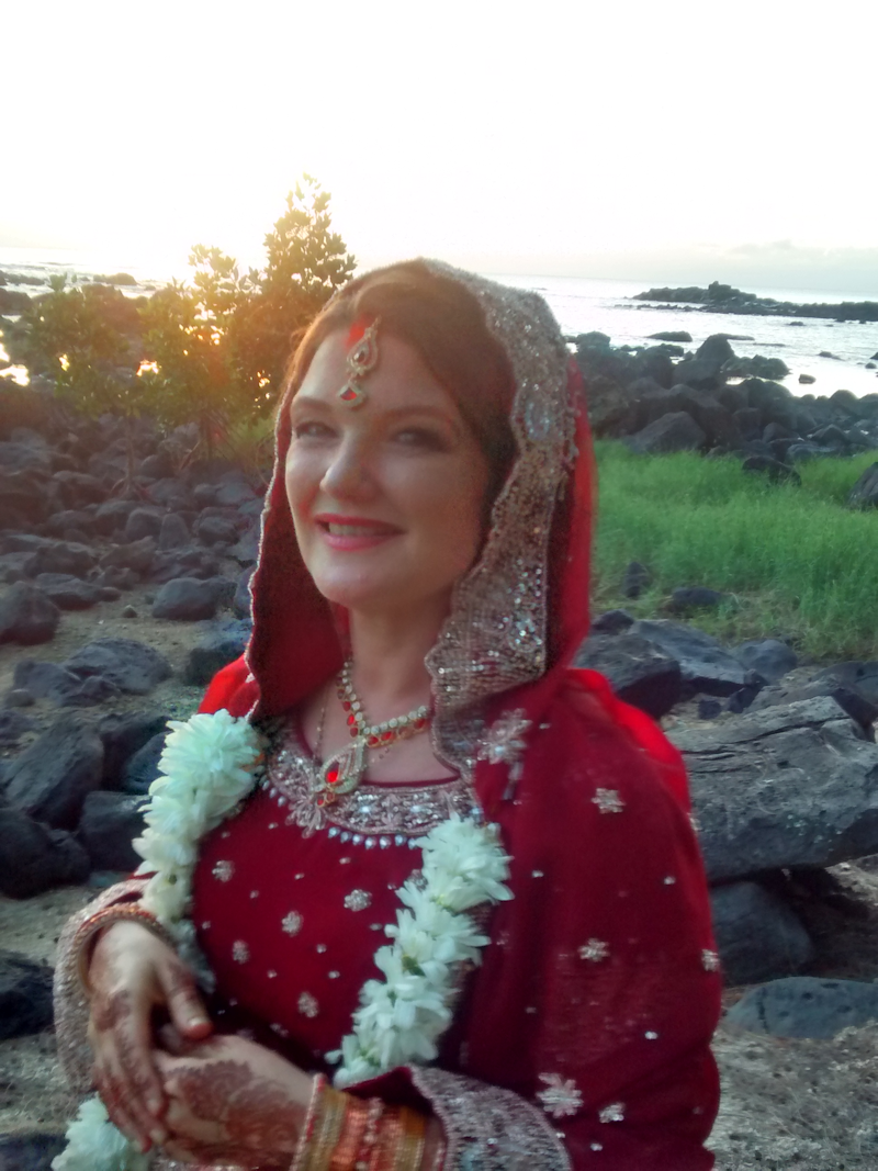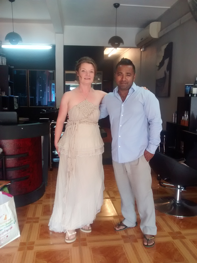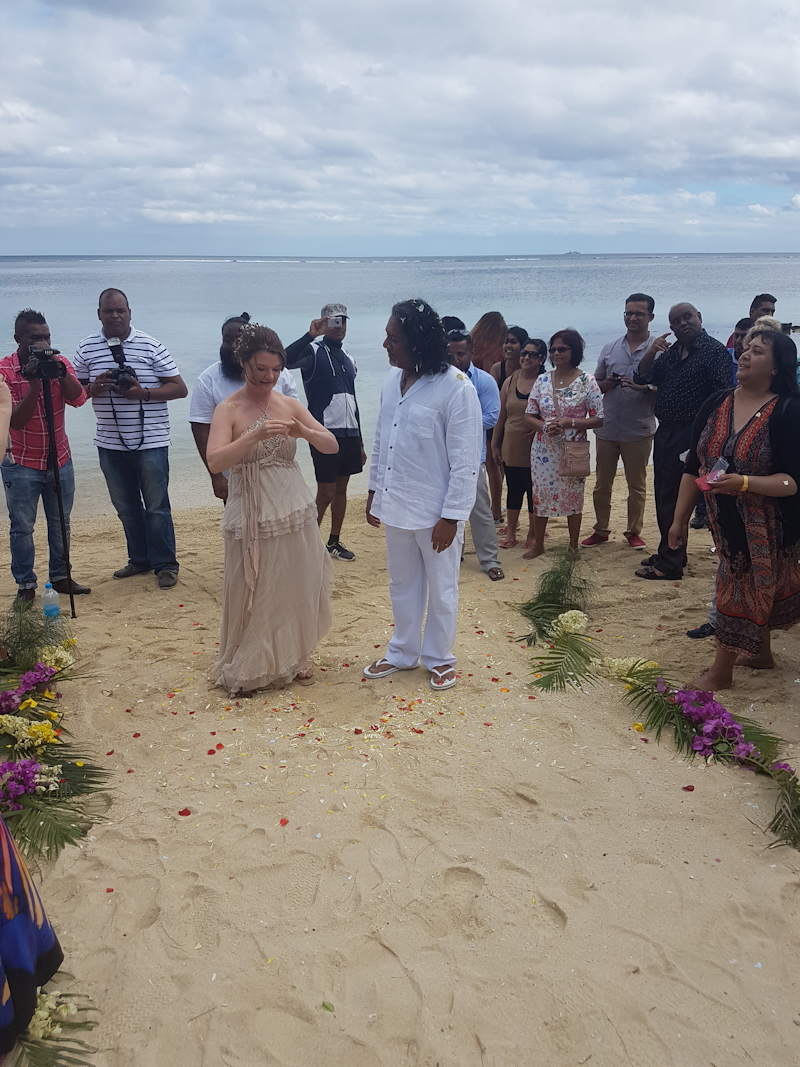 Wednesday 31 May 2017: The Beach Wedding (ceremony number 1) Here, I 'deliver' Voy into the safekeeping of Sanjay as an alternative to walking down the aisle. The little sandy aisle bordered by flowers was far more pleasant than inside a church or temple. |