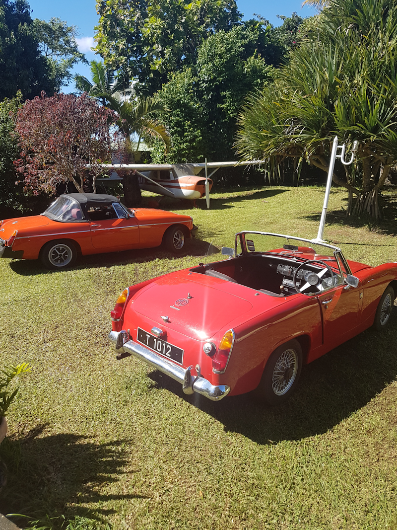 We drove down to a select restaurant near the botanical gardens at Pamplemousse. In the grounds of the venue was a collection of restored cars from the fifties and sixties, including this MG. |