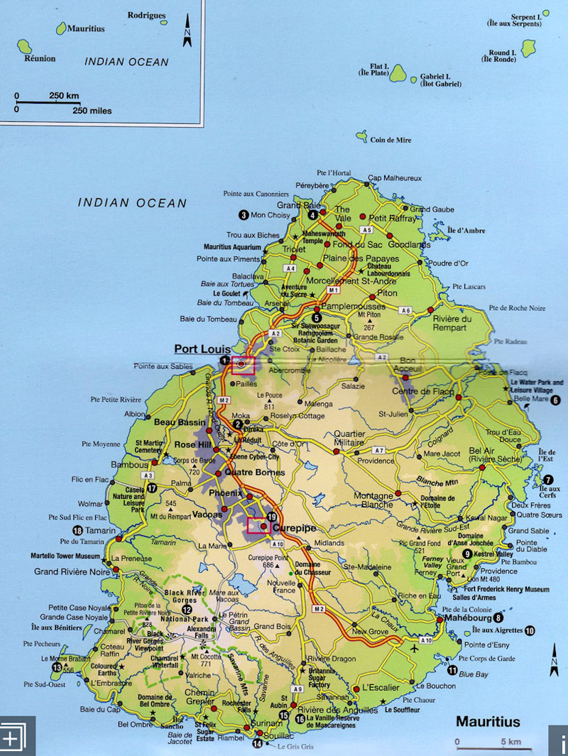 Map of Mauritius An independent republic with a population of about 1.3 million. Size of the island is approximately 38 miles (N to S) by 28 miles (E to W). Early settlers were Portugese (around 1500), Dutch 1598-1658, French 1715-1810, then Britain took over until independence in 1968. |