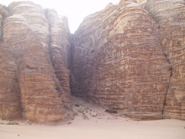(18) Wadi Rum - our overnight camp site dwarfed by the mountains.