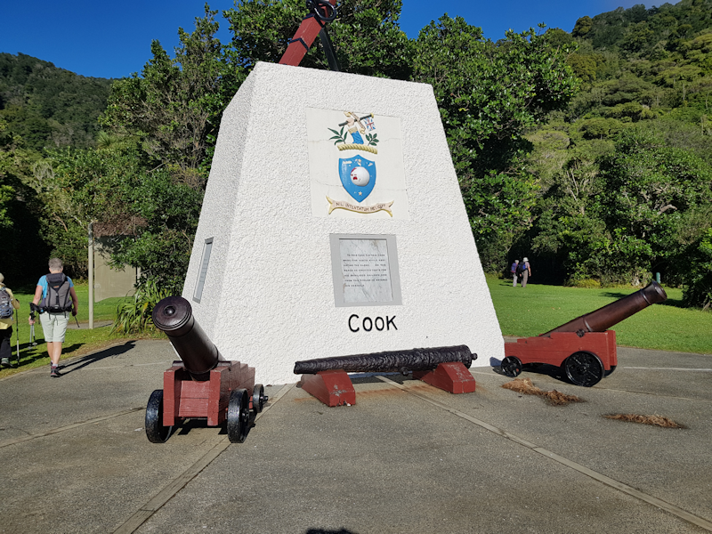 15 km down the coast to Furneaux Lodge. Here at the start is an impressive monument to Captain James Cook who landed here on one of his later voyages.