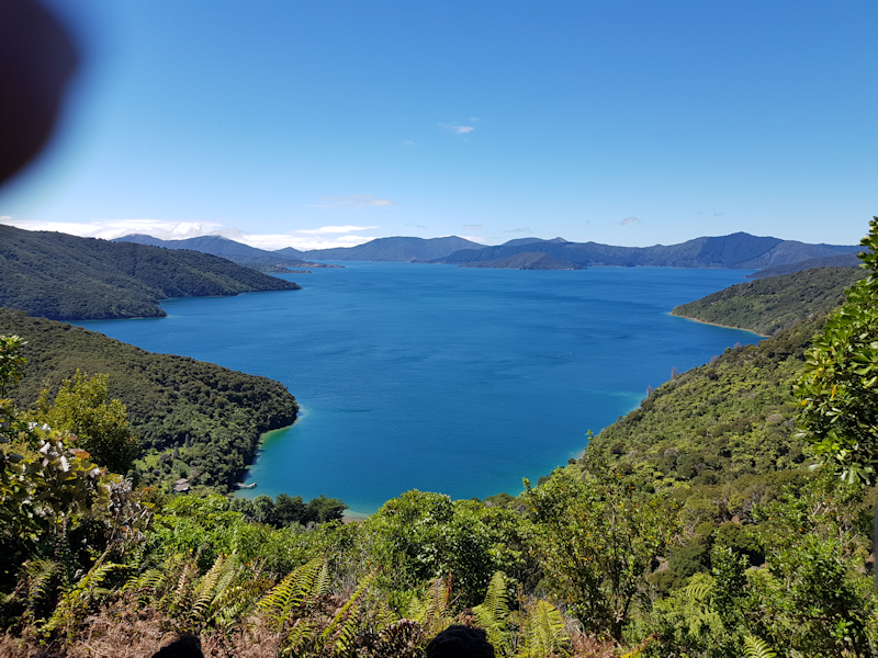 Having made the initial ascent from Ship Cove we now have a beautiful view of Resolution Bay to our left. Note the ferns, which are found in many guises everywhere in New Zealand.