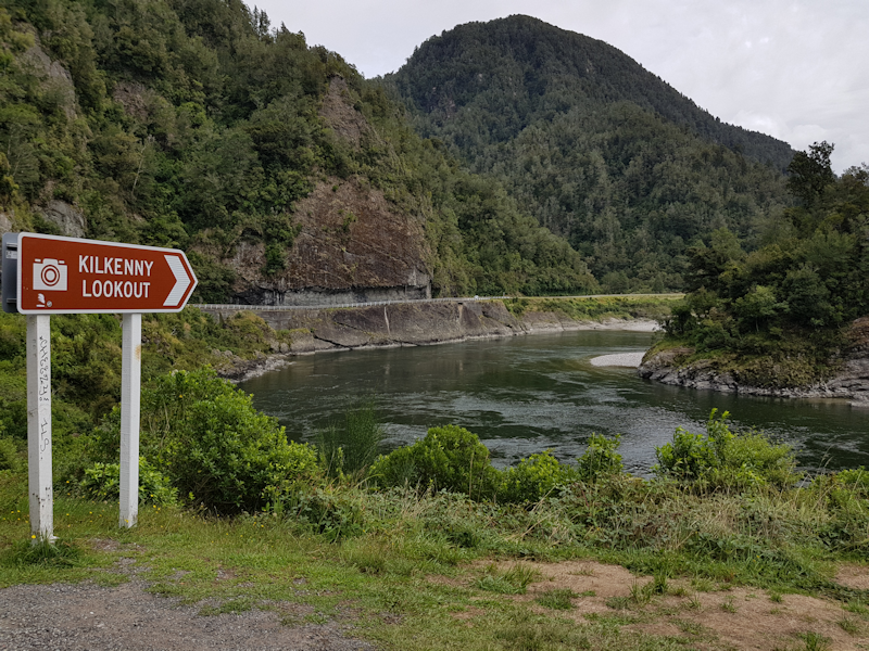 The Kilkenny Lookout on a bend in the road alongside the Lower Buller River Gorge. We are driving on the State Highway 6 towards Westport.