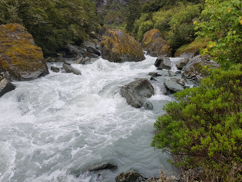 The Rob Roy stream which gushes down to join the Matukituki River.