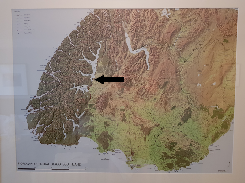 The map was on the wall at the hotel we stayed at for three nights. I've marked in a black arrow the town of Te Anau.