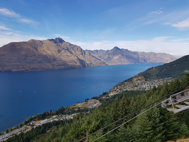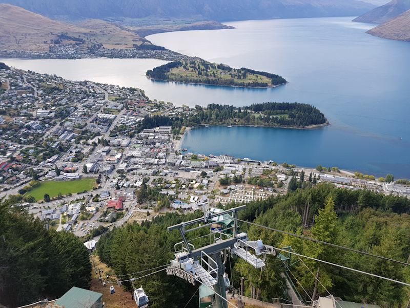 In Queenstown for lunch, the cable car can be seen rising up and going down in a gash cut in the tree covered peak rising behind the town.