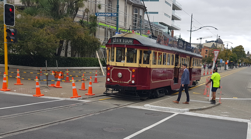 A tram, heading west, away from Cathedral Square.