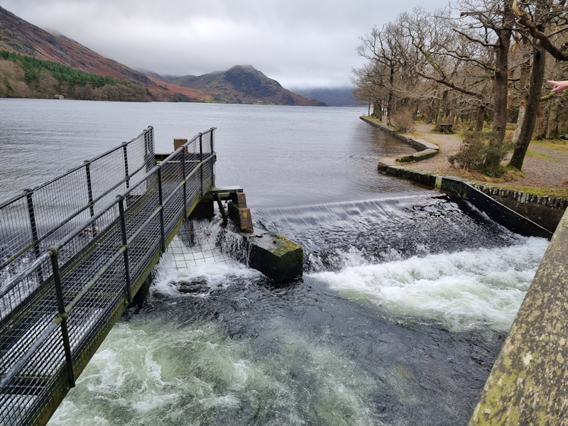 Outflow from Crummock Water flows into the River Cocker. There is a fish ladder on this weir for those fish who are desperate to reach Crummock Water.