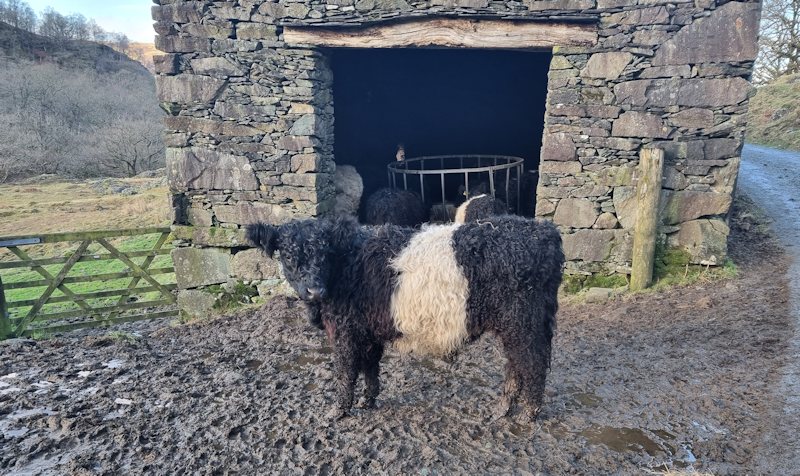 A belted Galloway cow at a barn heading north.