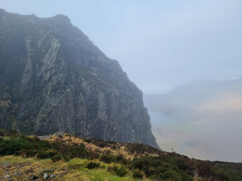 The huge massif of Mellbreak on the west bank of Crummock Water partially hidden by cloud.