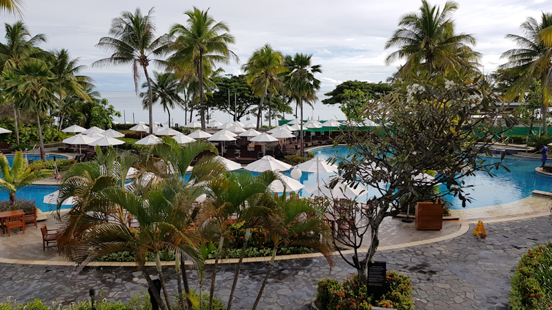 A seaward view of the pool and leisure areas of the 'Sofitel Fiji Resort and Spa' at Denarau Island, a resort complex near Lautoka, Fiji.