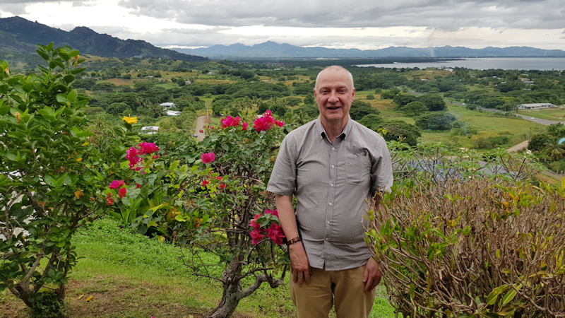 Our minibuses took a trip up a steep and bumpy dirt road up to a hilltop resort establishment which had panoramic views over the west and north coast of Viti Levu island. Here I stand precariously at the top of the slope.