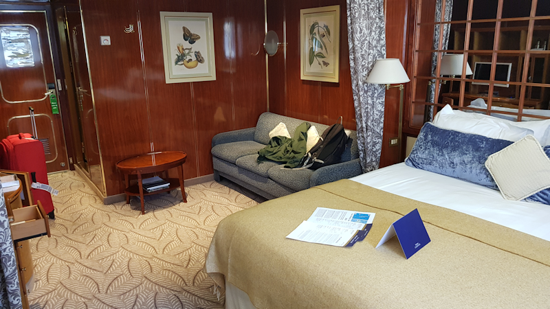 Wow, this is luxury! My first view of my cabin, looking towards the outer window, which is at a level where the hull becomes the superstructure.