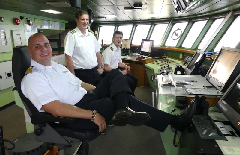 The captain, Jose Fonseca, First Officer and Navigator on the bridge preparing for departure.